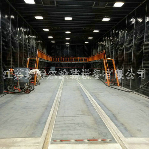 根據客戶要求及工件尺寸,房體工作尺寸設計為18x6x6.5m。本噴砂房體選用100mm方管做最基本框架的,內選用50方管做內的支撐,內鋪2mm角鋼及3mm生橡膠板,內面壁墻選用50mm厚彩厚鋼板瓦夾心板加工,外觀形象、的安裝省時、防蝕質量好。彩角鋼夾心層為聚苯氯乙烯發泡塑膠片,與一般用純角鋼打造的